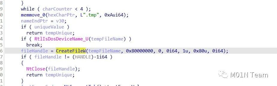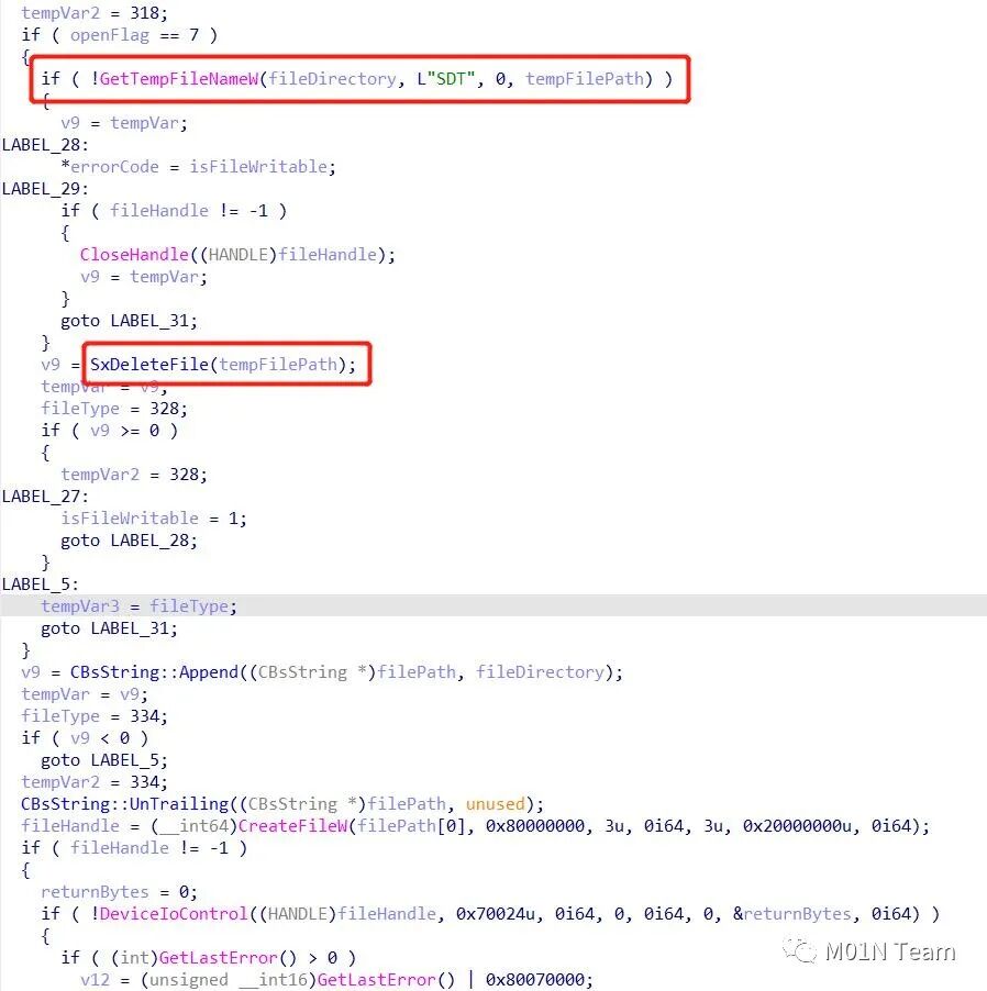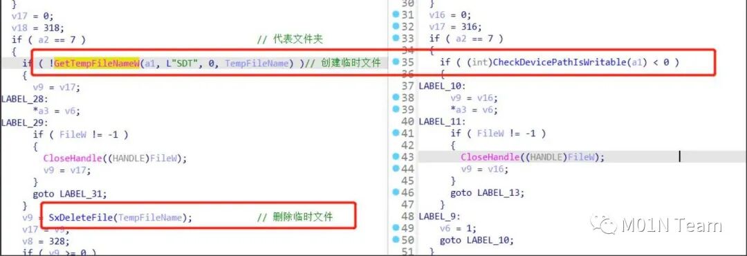 函数功能比较简单,该函数功能为判断文件或者文件夹是否可写,如果openFlag=7,说明该路径是文件夹,则调用GetTempFileNameW创建一个临时文件,并且删除该文件,如果删除成功则说明该文件夹可写。其次如果是文件,则尝试打开文件后调用DeviceIoControl函数向文件发送一个请求,判断文件是否可写。如果返回成功,则说明该文件可写。