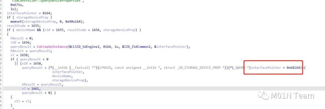 可以看出QueryStorageDevice是一个名为SdEngine2的com接口,而由于sdengin2.dll的特殊性,这个接口无法为我们直接使用,由于其本身是服务于SDRSVC备份服务,最终在sdrsvc.dll里面的CSdController::QueryDeviceProperties找到调用操作,函数中调用了ISdCommon2 COM接口中的方法,用于查询设备属性。