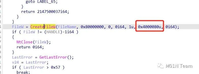 可以看到创建文件依然存在,但只是dwFlagsAndAttributes属性变为0x4000080,查询文档后得知加入了FILE_FLAG_DELETE_ON_CLOSE属性,即:该文件将在其所有句柄关闭后立即删除,其中包括指定的句柄和任何其他打开或重复的句柄。