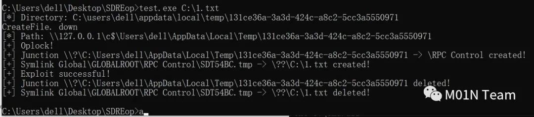 这里我们通过ReadDirectoryChanges函数监控目标函数创建文件行为后创建机会锁锁住该文件,然后设置文件路径指向目标文件后释放机会锁,从而实现任意文件删除。