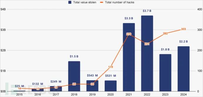 这一数字占年度被盗资金总额的61%,相较于2023年增加了21%。尽管2024年的事件总数达到了创纪录的303起,但总损失金额并未创下新高,因为2022年的损失仍然最为严重,达到了37亿美元。