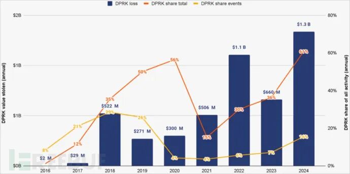 根据区块链分析公司Chainalysis的最新报告,曹县黑客在2024年通过47次网络攻击,窃取了价值13.4亿美元的加密货币。