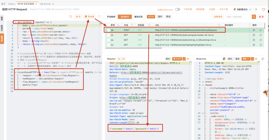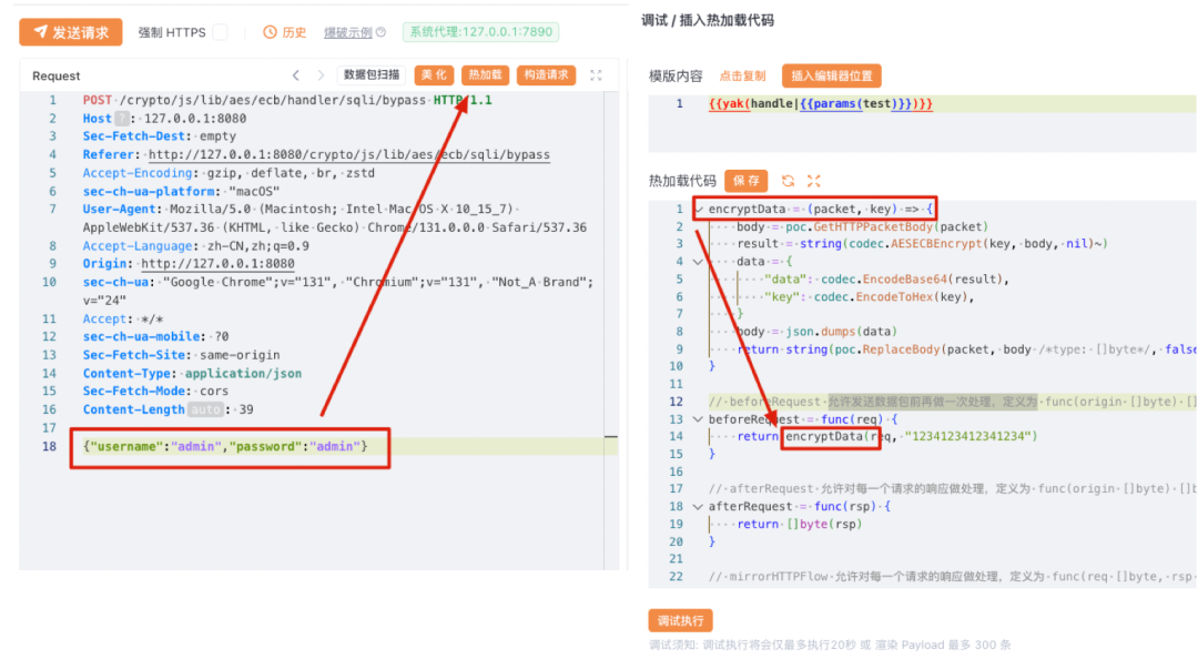 这样我们就可以直接把 MITM 的数据包发送到 Web Fuzzer,直接修改明文数据,通过 Web Fuzzer 热加载去加密数据包发送,并且保证展示也是被解密的。
