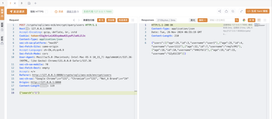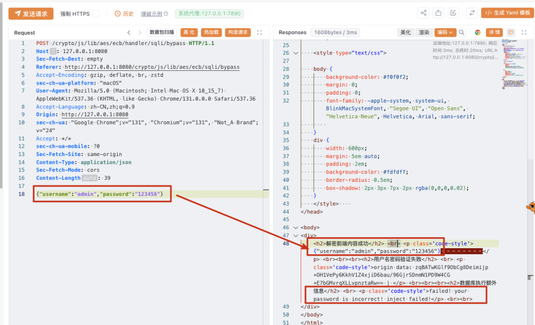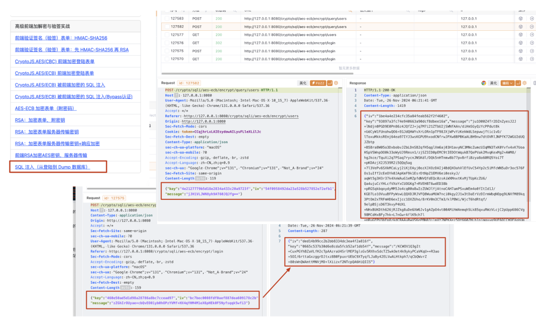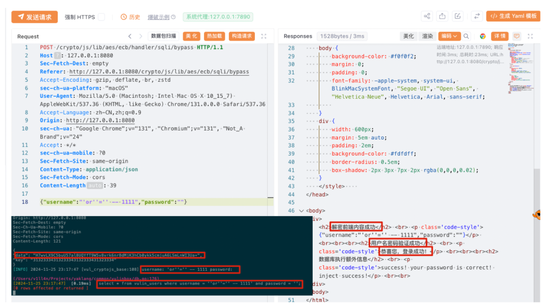 我们通过热加载主动去修改了数据包的内容,进行了加密,直接绕过了上述加密和解密内容,成功测试了这个漏洞。
