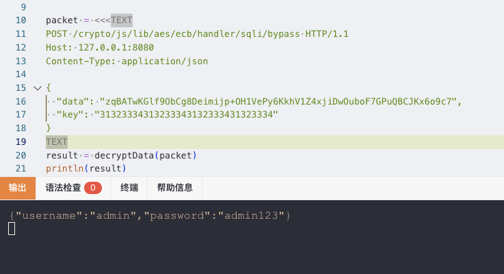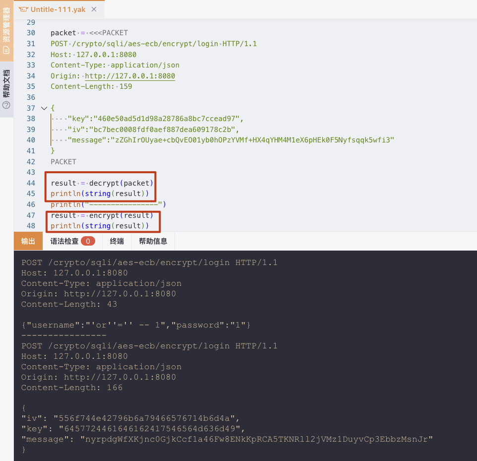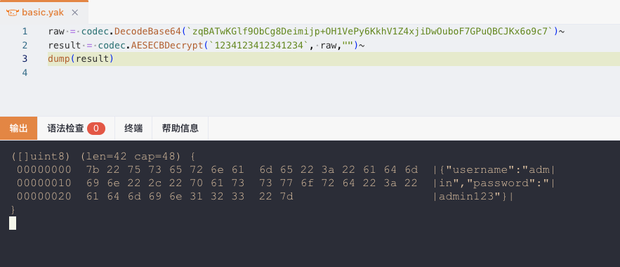 我们把上个数据包的秘文和密码取出来,使用 Yak Runner 写出证明我们解密成功了: