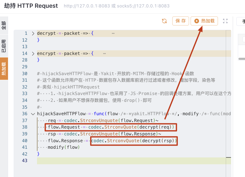 hijackSaveHTTPFlow 这个函数,这个函数可以在数据包进入数据库之前进行一次修改,我们可以在这里解密数据包,保证数据包传入的是正确的。