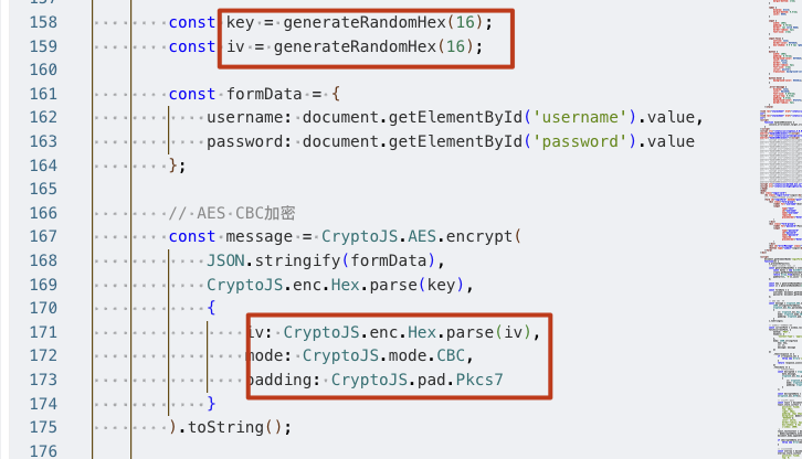 随机 key 和随机初始偏移量,AES CBC 加密,Pkcs7Padding,并且我们发现数据包内已经带上了 iv 和 key 的 hex 编码后的内容,类似如下的格式: