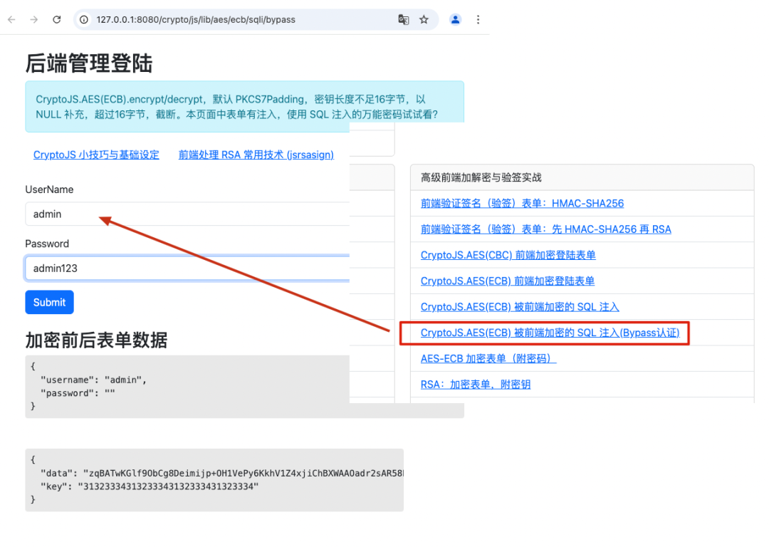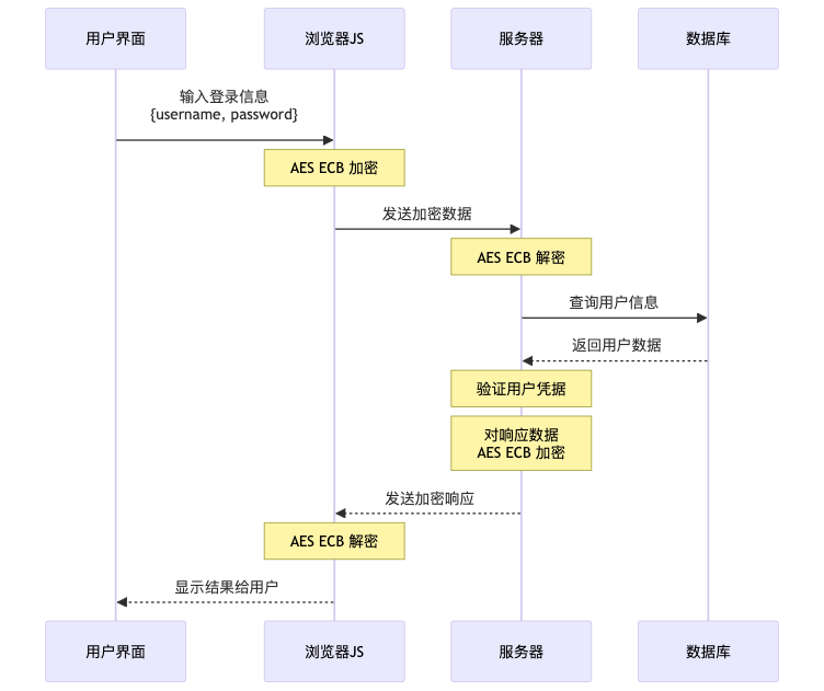 我们考虑以下登陆场景,在这个场景中,用户界面和服务器之间通信使用浏览器 JS 加密,前后都用 AES ECB 加密。