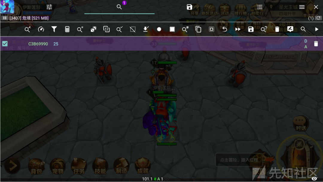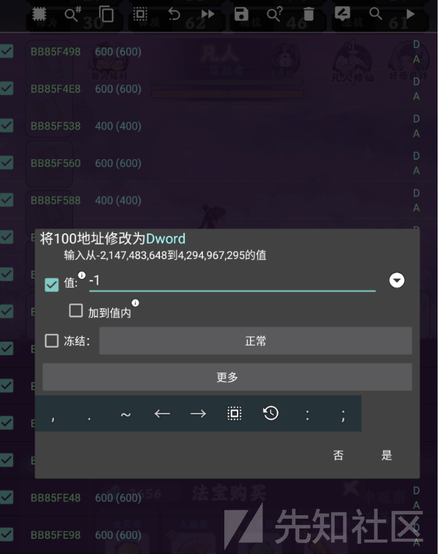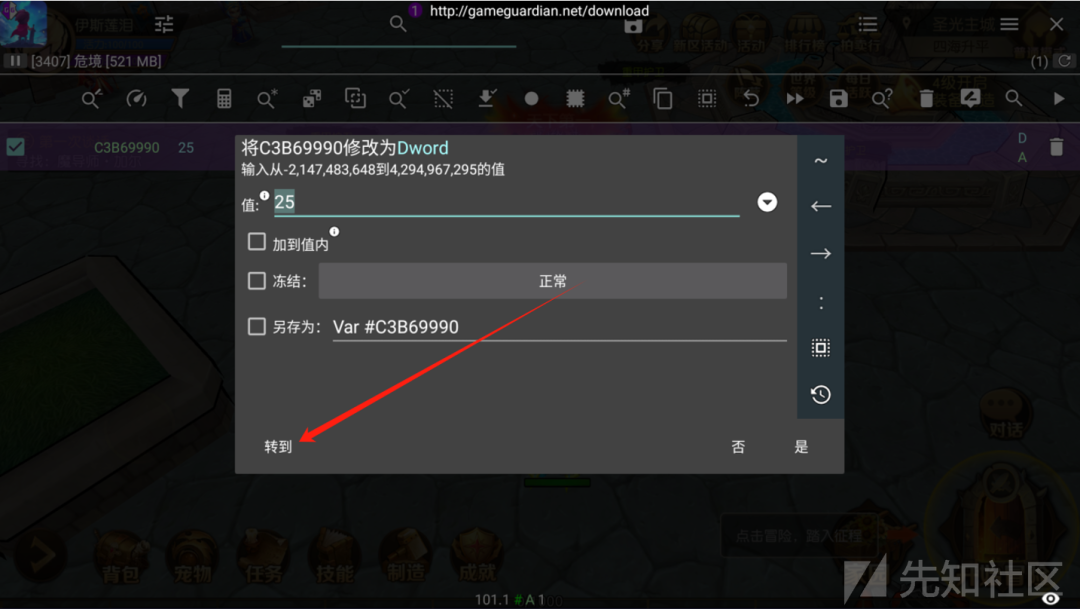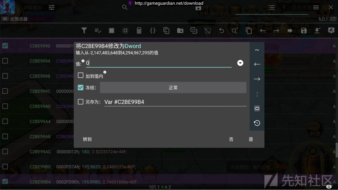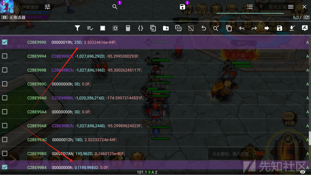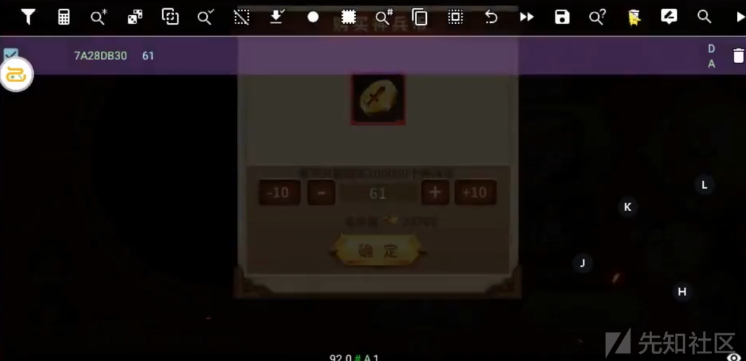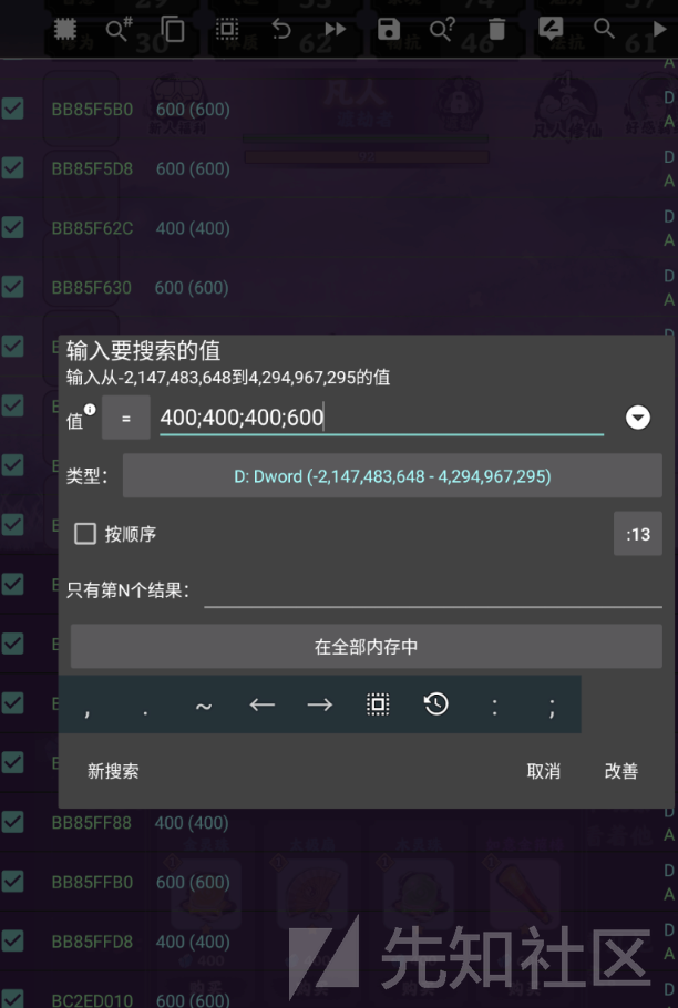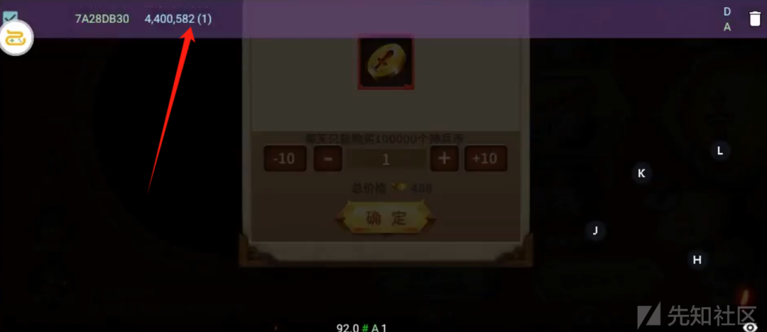 首先都是异或搜索,在数值后面加上X4,注意X不是乘号搜索找到一个很大的值,一般是十位数且开头为1或2找到后转到,上面也有一个很大的值,两个值的差就是我们想要修改的值