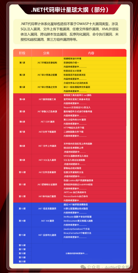 .NET代码审计体系化星球包括但不限于OWASP十大漏洞类型,涉及SQL注入漏洞、文件上传下载漏洞、任意文件操作漏洞、XML外部实体注入漏洞、跨站脚本攻击漏洞、反序列化漏洞、命令执行漏洞、未授权和越权漏洞、第三方组件漏洞等等。