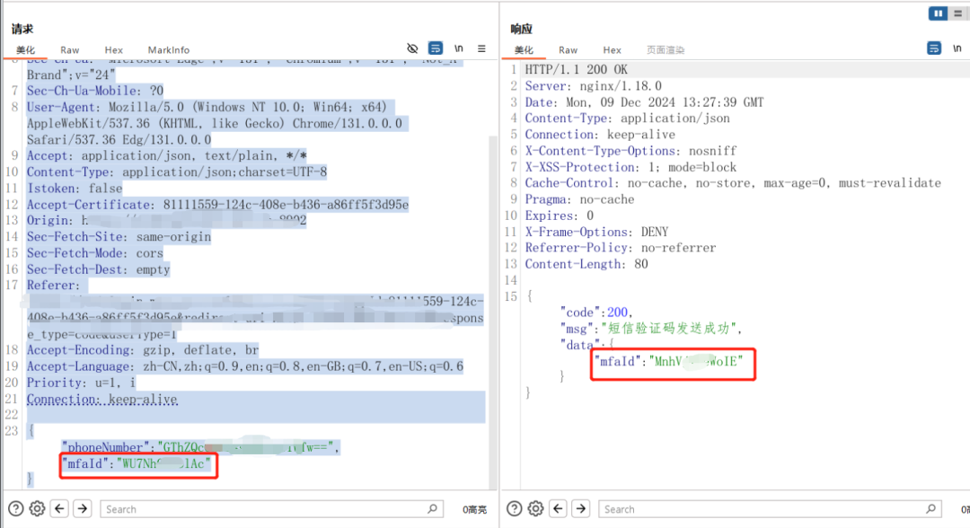 抓取发送验证码数据包并发送可以发现发送包和回响包都有一个mfaid值