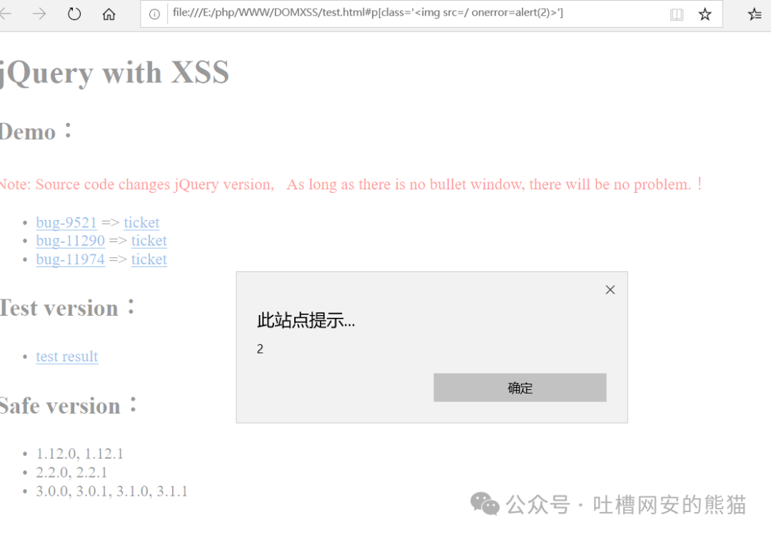 然后本地浏览器打开poc点击test result,弹窗则证明存在漏洞: