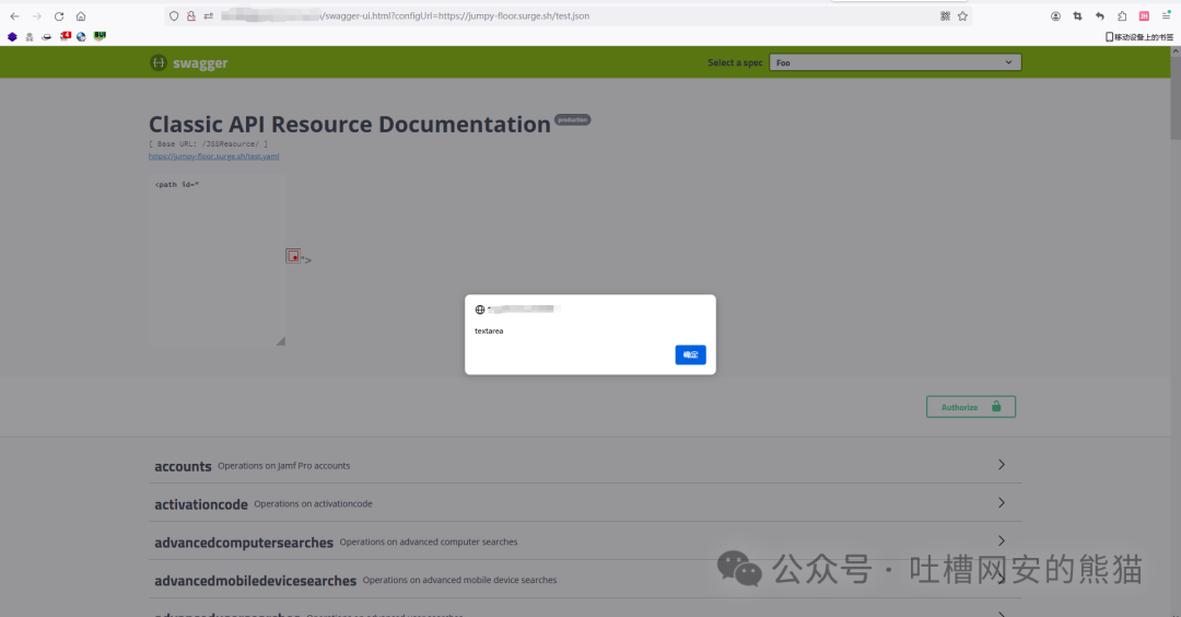 然后在Swagger-UI中使用?configUrl=和url参数复现XSS漏洞,加载的类型比如这样: