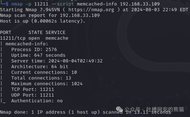 nmap -sV -p 11211 --script=memcached-info 目标ip