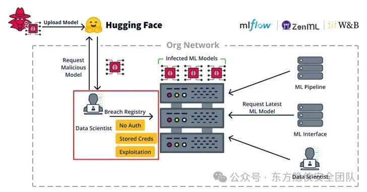 与第一批涉及服务器端漏洞的缺陷不同,新发现的漏洞存在于处理 SafeTensors 等安全模型格式的库中,可被用于攻击 ML 客户端。该公司表示:“劫持组织中的 ML 客户端可能使攻击者在组织内进行广泛的横向移动。ML 客户端很可能有权访问重要的 ML 服务,如 ML 模型注册中心或 MLOps 管道。” 这进而可能会暴露模型注册凭证等敏感信息,实际上允许恶意行为者在存储的 ML 模型中植入后门或实现代码执行。