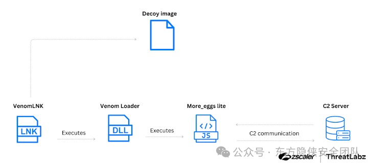 第二个活动同样以 VenomLNK 开始,用于传递诱饵图像,同时秘密执行 Venom Loader。该加载器负责启动 More_eggs lite,这是 JavaScript 后门的一个轻量级变体,仅提供 RCE 功能。