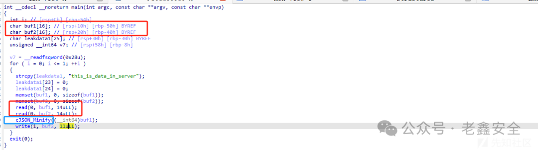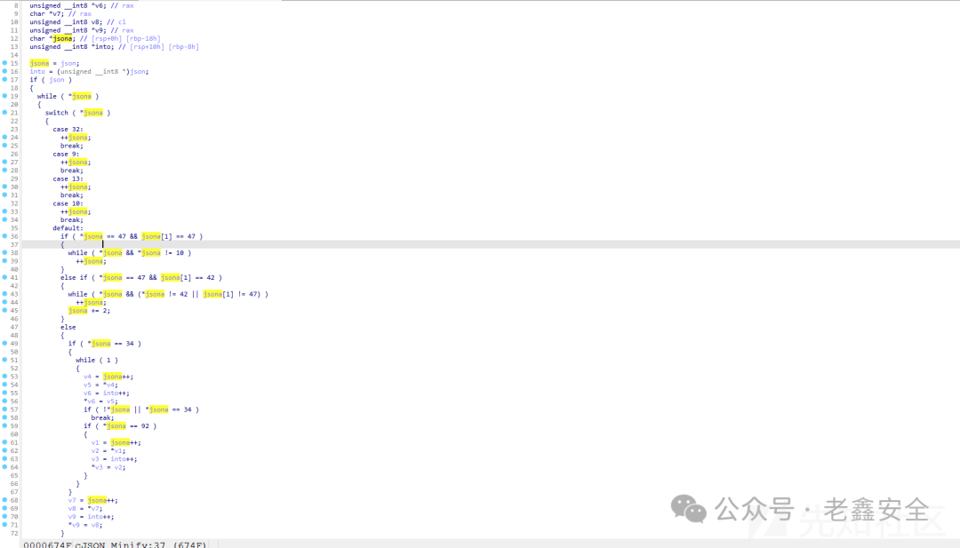 这里初看是没有什么漏洞的,不存在溢出和连带读的情况,但是有个cJSON_minify函数 通过ida对给的libcjson文件静态分析发现