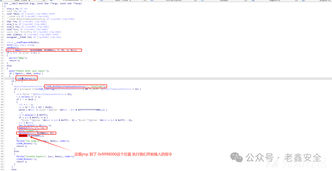 这里有个cJSON_Parse 将JSON字符串反序列化为CJSON结构体 并且cJSON_GetObjectItemCaseSensitive(v7, “shellcode”); 取的是shellcode的值 因此我们只要