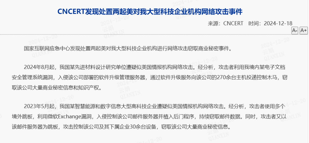 近日,国家互联网应急中心(CNCERT)通报已处置了两起疑似源自美国情报机构对我国大型科技企业进行网络攻击窃取商业秘密事件。通过对两起事件综合分析,发现了其共同特征:攻击者首先利用目标企业部署的第三方软件系统中的安全漏洞进行渗透,随后借助植入的木马或后门程序进一步窃取敏感信息。