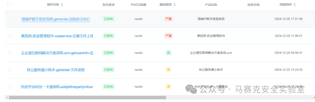 本周赛克安全更新漏洞插件11个,涉及国威IP数字语音系统-generate-远程命令执行、黄药师-药业管理软件-xsdservice-任意文件上传、企企通互联网解决方案系统-srm-getuserinfo-信息泄露、快云服务器小助手-getdetail-文件读取、杭州平治科技一卡通系统-addpkfreepartymfcar-sql注入