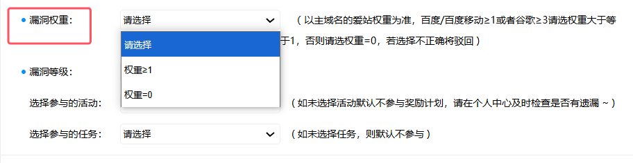 漏洞时需要进行权重选择,请选择正确的权重,否则将被驳回,平台已注册企业无需选择,均会发放KB。