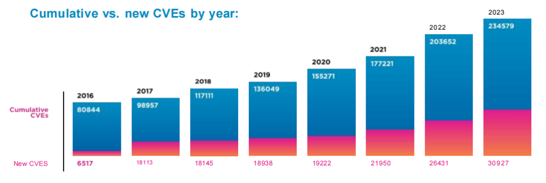 2023 年,全球新增通用漏洞披露(CVE)数量如脱缰之马,一举突破 30,000 个大关,相较于上一年增长幅度高达 17%。这一数据不仅仅是简单的数字堆砌,背后实则反映出软件系统复杂性呈指数级攀升、互联设备如雨后春笋般激增以及安全研究投入持续加大等多方面因素的综合影响。从国家漏洞数据库(NVD)的历史记录来看,过去 30 年累计记录的 234,579 个漏洞中,近一半集中在最近五年被发现,这清晰地表明漏洞披露的频率已进入一个前所未有的高速阶段,同时漏洞本身的复杂程度也在与日俱增,仿佛一颗隐藏在网络世界深处的 “定时炸弹”,随时可能引爆安全危机。