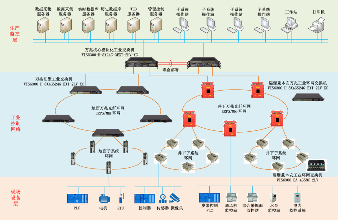 核心层部署威努特WIS6300-H-8X24C-3EXT-2HV-XC工业交换机,通过堆叠实现双机热备和负载均衡。地面、井下骨干层采用威努特WIS6300-H-8X4GS24G-EXT-2LV-XC工业交换机组成10G或40G光纤环网,上联到核心工业交换机。地面、井下所有接入交换机可以组成1G或10G光纤环网,通过相切环的方式就近接到汇聚交换机。井下部署的工业交换机全部放入隔爆兼本安箱或本安箱中,并配备不小于4小时的后备电源输出。
