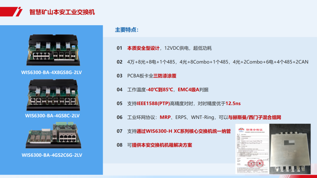 WIS6300-BA系列是威努特最新研发的本质安全型工业交换机,专为智慧矿山井下隔爆兼本安应用场景设计。该系列工业交换机采用本质安全型电路设计,且电路板带有三防涂层,满足智慧矿山井下环境要求。最大配置支持8个1Gbps电口、8个1Gbps光口、4个10Gbps光口和1路RS485接口。