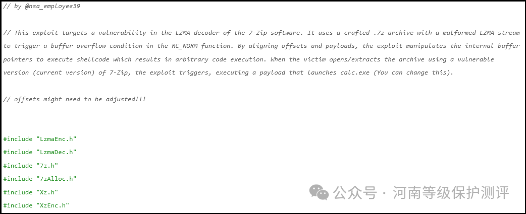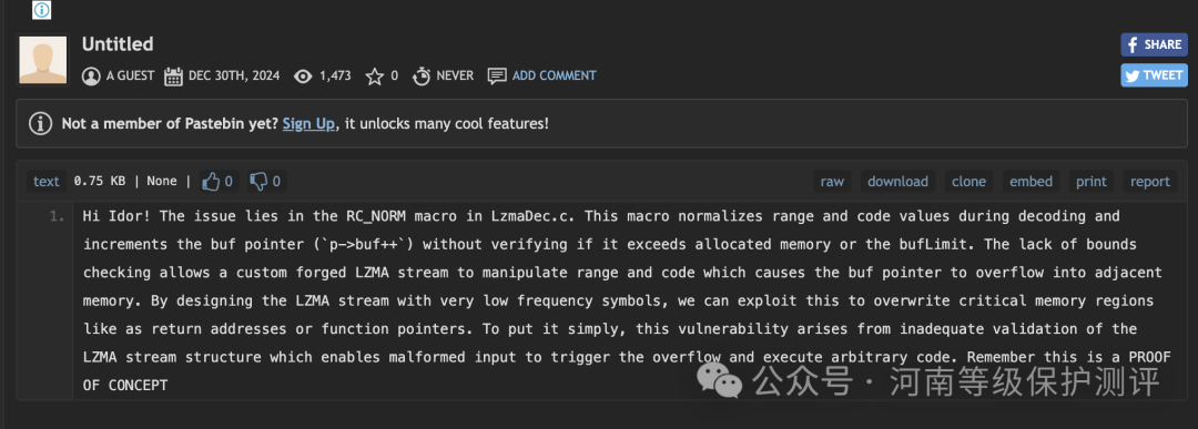 @NSA_Employee39 账户在 Pastebin 上分享了最新消息:“该漏洞源于对 LZMA 流结构的验证不足,导致格式错误的输入触发溢出并执行任意代码。请记住,这只是一个概念验证。”