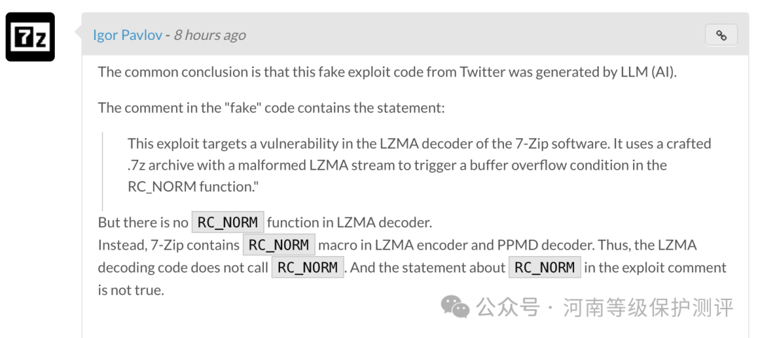 Igor Pavlov 否认了 X 账号分享的说法,他表示“LZMA 解码器中没有 RC_NORM 函数。相反,7-Zip 在 LZMA 编码器和 PPMD 解码器中包含 RC_NORM 宏。因此,LZMA 解码代码不会调用 RC_NORM。漏洞注释中关于 RC_NORM 的说法是不正确的。”