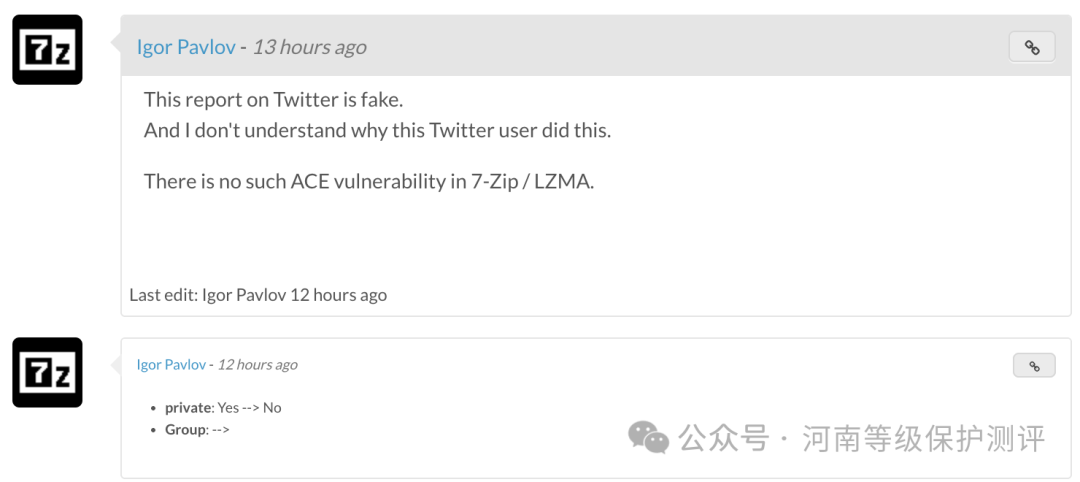 7-Zip 的创建者 Igor Pavlov 在 7-Zip 论坛的漏洞部分驳斥了这些说法,他表示:“Twitter 上的这个报告是假的。我不明白为什么这位 Twitter 用户会做出这样的声明。7-Zip/LZMA 中不存在 ACE 漏洞。”