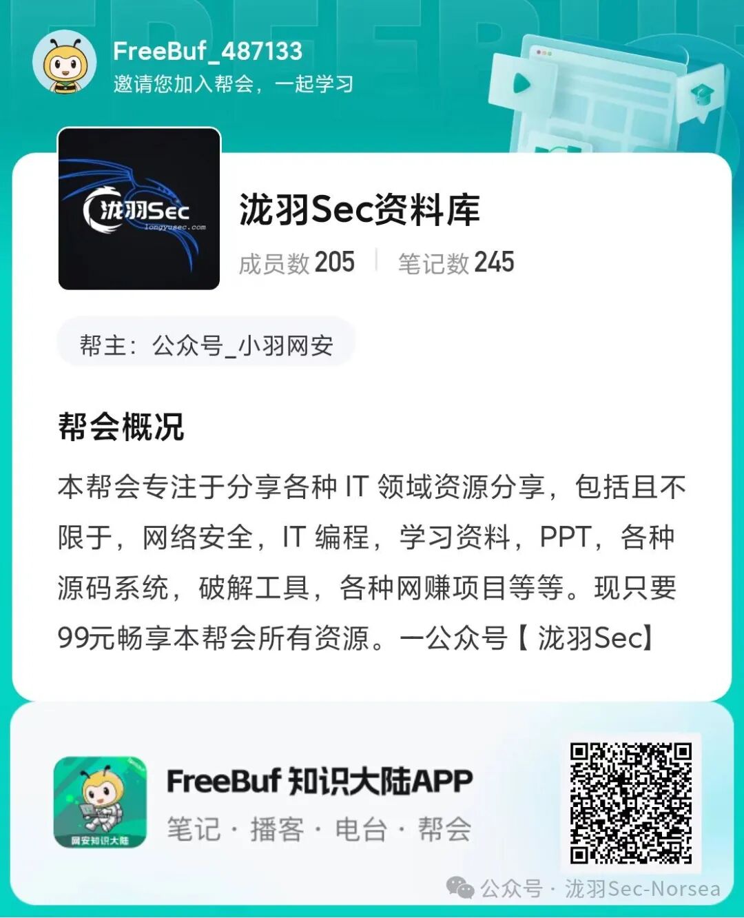 推荐加入我们的帮会,专为红队实战打造!帮会定期分享网上找不到的珍贵资源,特殊限时提供的安卓远控工具(7.4版)等。此外,还有大量Poc、渗透工具、课程资源以及实战案例,帮助你快速提升渗透技能。前100位仅需 99元就可以享受终身使用,人多后价格会上涨,机会难得,别错过!