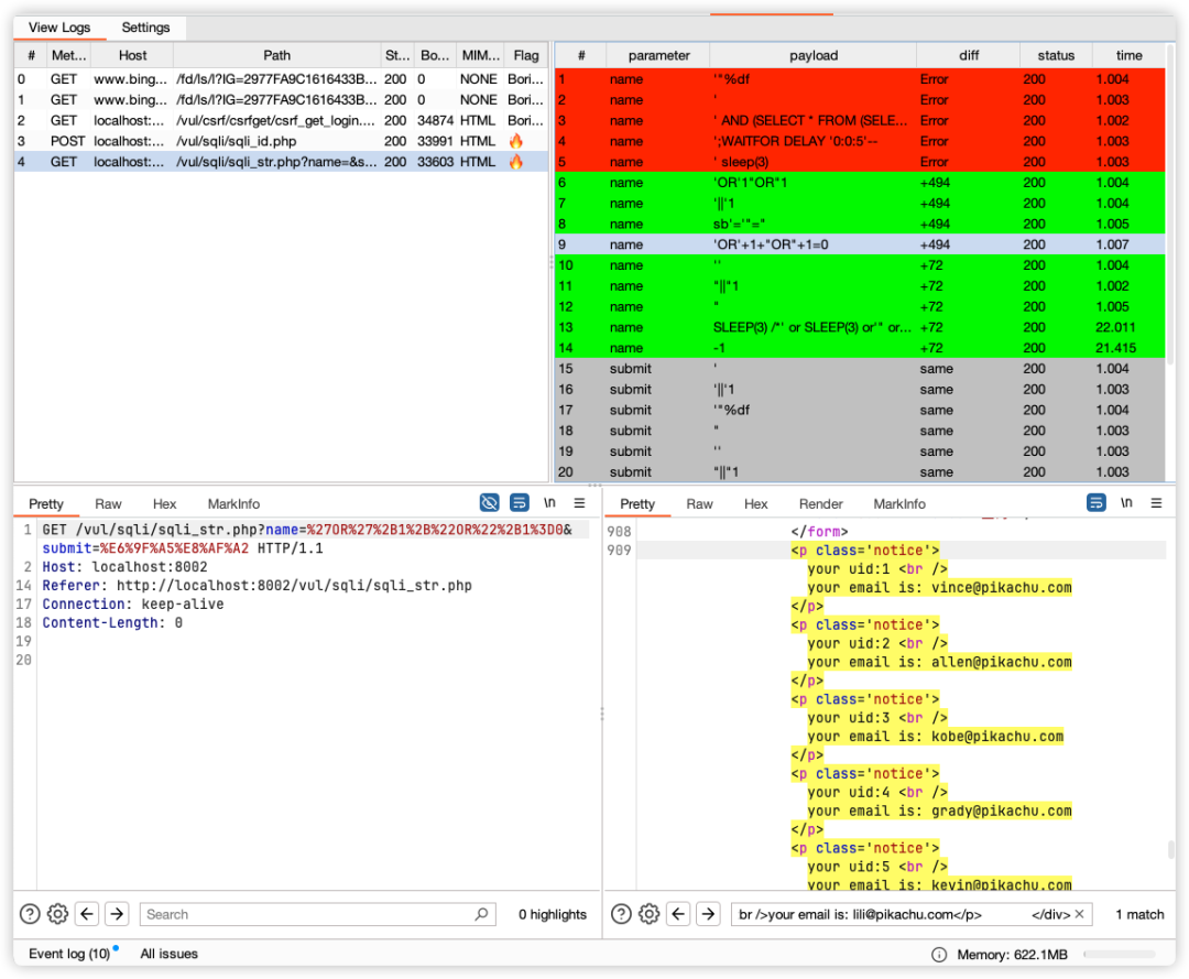 4.使用 Burp Suite 的代理、扫描器等功能进行测试,SQL Injection Scout 将自动应用配置并提供结果。