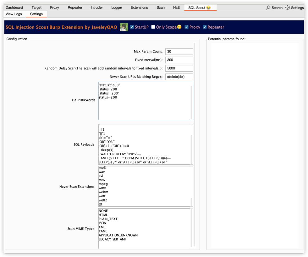 选项卡中,找到 SQL Injection Scout 并打开其配置面板。 -