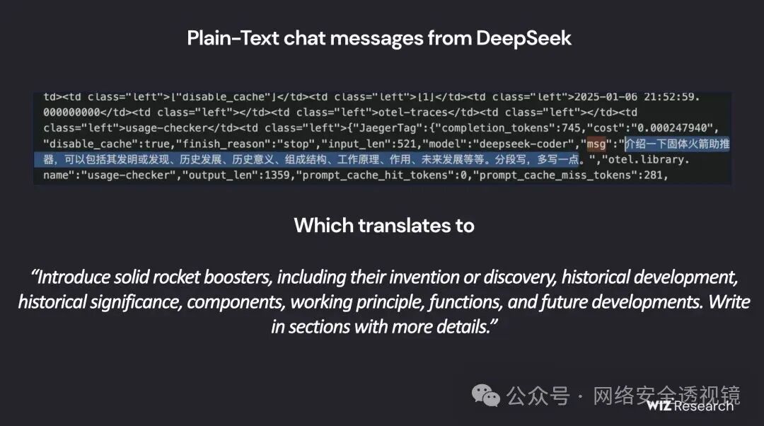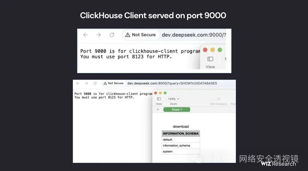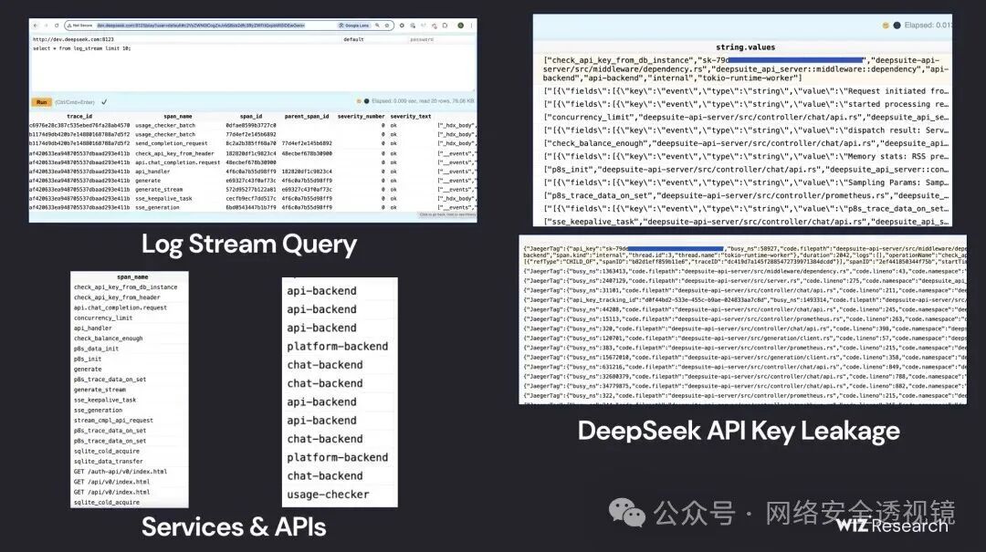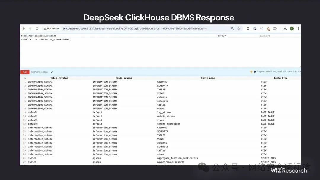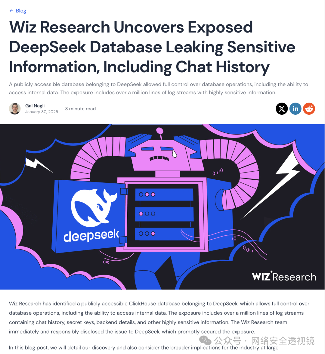 Wiz Research 团队,近日国外爆出DeepSeek 的一套可公开访问的 ClickHouse 数据库,允许对数据库进行完全控制,包括访问内部数据。此次暴露包含超过一百万行的日志流,其中含有聊天记录、密钥、后端细节以及其他高度敏感的信息。