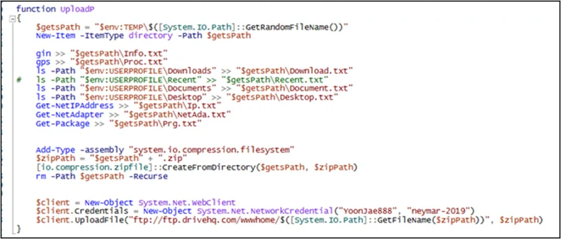 此最终有效载荷收集计算机信息、进程列表、目录列表、IP 地址和网络适配器信息以及已安装的更新,并使用硬编码凭据将它们以 ZIP 存档形式上传到外部 FTP 服务器。