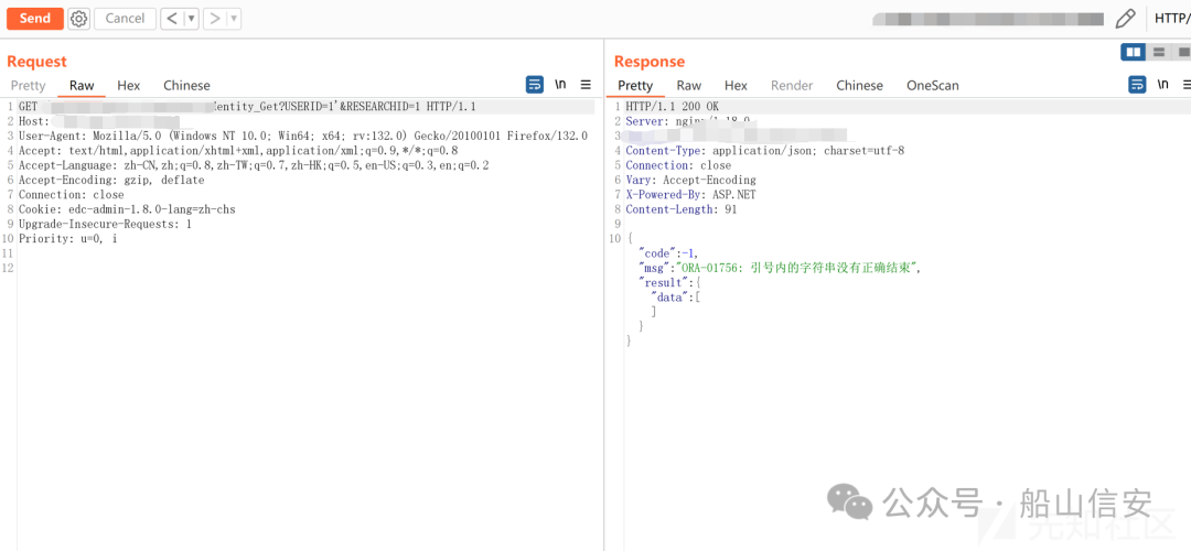 访问该接口抓包,使用burp进行测试,通过单引号重放发生报错
