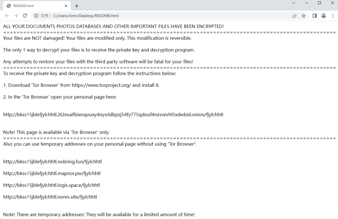 样本启动后,会加密系统中的部分文件,并释放勒索信以诱使受害者通过勒索信中的联系方式与攻击者进行沟通及缴纳赎金,其中被加密文件添加扩展“mhkgchqs”,勒索信文件名为“README.html”,勒索信中并未表明赎金金额及支付方式。