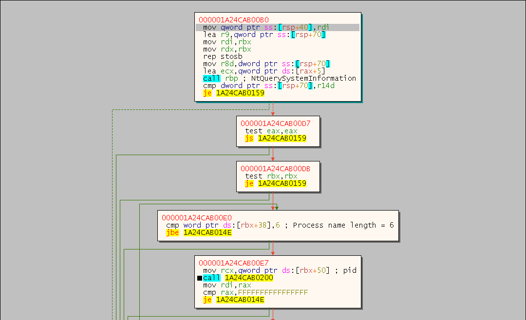 解密代码后,首先会枚举受感染系统上所有正在运行的进程以识别勒索软件可以在其中注入shellcode的进程,Magniber将解压后的shellcode注入满足以下条件的进程