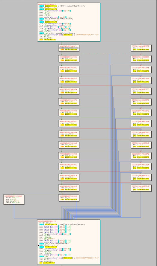 该病毒会释放DLL格式的文件,该文件导入表、执行主体在DLL主函数中,释放shellcode到内存并执行,无文件加载能够降低自身被内存代码检测引擎发现的风险,同时Magniber并不直接通过调用API实现相应功能,而是模拟相应API在ntdll中的行为,传入参数,然后指定syscall ID,直接调用syscall,同样可以实现直接调用系统API的作用。