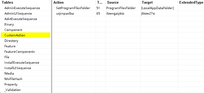 使用Orca打开MSI文件查看表的结构和内容。发现MSI会调用CustomAction属性执行MSI内嵌DLL的导出函数j6tow27o。