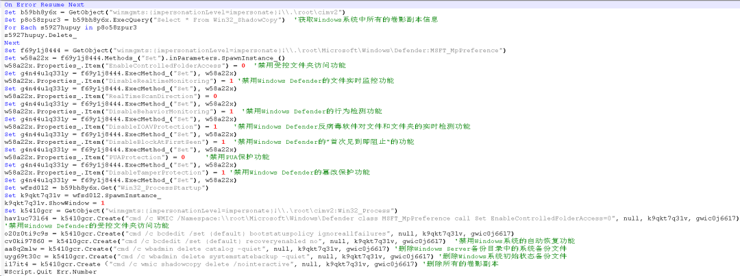 执行VBS脚本,删除卷影副本,禁用Windows系统恢复功能。
