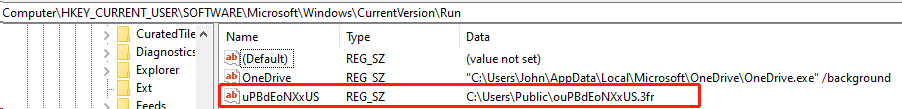在HKCU\SOFTWARE\Microsoft\Windows\CurrentVersion\Run 注册表中添加一个键值,其中ouPBdEoNXxUS.3fr文件为密钥文件