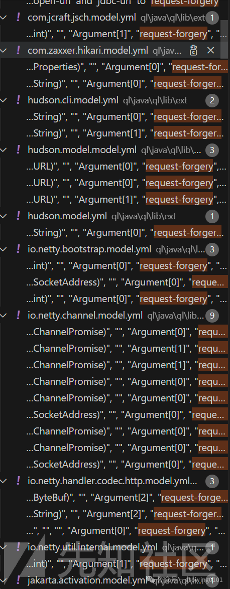 他的实现类是 DefaultRequestForgerySink 类,而匹配的是 request-forgery 类型